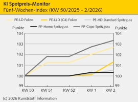 Die deutsche Konjunktur kommt nur langsam aus der Schwächephase. Zwar erwartet die Wirtschaft branchenübergreifend einen leichten Aufwärtstrend von der zweiten Jahreshälfte an. Doch bislang halten sich auch in der kunststoffverarbeitenden Industrie etliche Unternehmen mit Investitionen zurück. Das zeigt die aktuelle Konjunkturumfrage der Industrievereinigung Kunststoffverpackungen für das erste Quartal... (14.01.2026)
