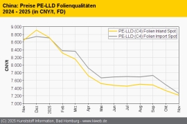 Die monatlichen Durchschnittspreise der berichteten Standardkunststoffe mit Ausnahme von PET lagen im November 2025 unter dem Niveau des Vormonats. Die hohen Lagerbestände sowie eine saisonal bedingt schwache Nachfrage in den verarbeitenden Betrieben drückten die Notierungen tiefer. Die Vorproduktpreise stiegen zwar überwiegend an, doch nur bei PET war der Effekt der höheren PTA-Kosten stark genug, um den... (10.12.2025)